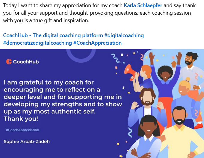 Today I want to share my appreciation for my coach Karla Schlaepfer and say thank you for all your support and thought-provoking questions, each coaching session with you is a true gift and inspiration.